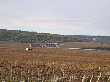 | 延々と続くぶどう畑、山の斜面まで何キロかありそうです。(フェヴレというドメーヌの畑) |