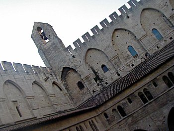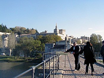| アビニヨン(サン・べネぜ橋)橋の上で強風に吹かれて手すりに掴まろうとしている平社長。前方のお城は「法王庁宮殿」でこの後で見学した。下に流れる川は「ローヌ川」。新原夫人が「アビニヨンの橋で踊ろよ、踊ろよ・・・・・」と歌詞をよく覚えていらして、皆で合唱していい思い出となった。このアビニヨン橋は、度重なるローヌ川の氾濫で4本の橋桁と橋を建造した聖べネゼを祀るサン・ニコラ礼拝堂を残すのみとなっている。 |