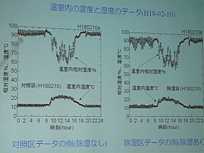 | 除湿装置なしの場合、95%以上の湿度になることもあるが、除湿装置があると90%程度にコントロールできる。 |