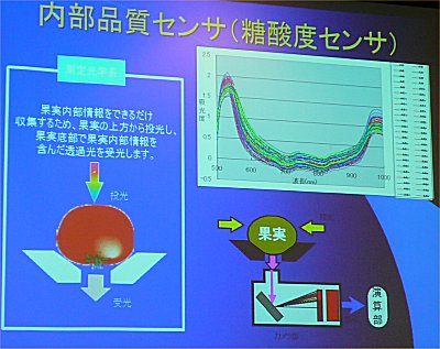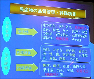 農産物の品質検査は現在は外部評価(外観による選別)やサンプルによる破壊検査が主である。しかし消費者の高品質や安全に対するニーズの高まりとともに全品検査が求められる時代がくるであろう。現に工業製品では全品検査があたりまえになっている。 全品検査になると非破壊検査技術が求められ、ミカンやキュウリなどの選果分野で導入が始まっている。 今後ますます精度の高い検査技術が求められるが、永田教授は分光画像による計測法(スペクトル画像計測法)に取り組んでおられる。 本講義では農産物の品質検査・評価の現状や非破壊検査のいろいろな方法について学び、さらにハイパースペクトルイメージングによる農産物の品質評価についての解説もあり今後の方向性を考える上で大変参考になった。 |