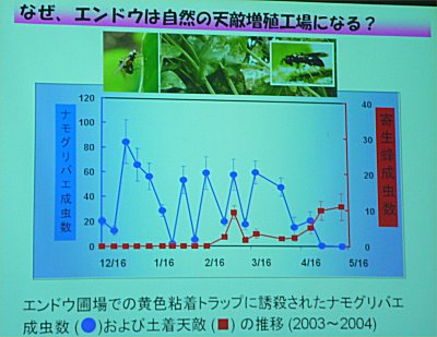 前回の大野助教授の講座No.10 「天敵を利用した減農薬栽培技術」では、日本の単位面積あたりの農薬使用量は世界一であることや、農薬を撒くことで天敵も殺し、結果として害虫が増え、さらに農薬が増えるという悪循環になっていること、IPM(総合的害虫管理)特に生態学に基盤をおいたIPMへと発想を変えていく必要性などについて学んだ。 今回は引き続き、環境負荷を抑えた農業についての講義であった。畑やビニールハウスには沢山の野菜が植えられており、自然の体系から考えるとおかしい。そのような環境では無農薬では無理で、最低限の農薬は必要であるが、今は量が多い。環境負荷低減型の農業にしていかなくてはならない。農薬の負荷が大きいと他の生物や作物に取り込まれるし、肥料を使いすぎると川に流れたり地下に浸透し、富栄養化や土壌・地下水の汚染につながる。 スイスなどでは有機・減農薬野菜の値段は高い。県の戦略として取り組む必要がある。高知県では小中学校の出前授業までして天敵を使った減農薬栽培の教育をしている。 農業の後継者不足の原因としては作業のきついことが大きな要因となっている。ナスやトマトの着果作業はホルモン剤で1つずつ処理していたが、マルナハバチを利用して手間が省けるようになってきた。 生態学に基盤を置いたIPMの目的は自然制御因子を最大限に引き出し、被害が及ばないレベルに管理することである。生物由来の(分解が早い)化学物質や合成フェロモンによる害虫防除などの技術も普及してきた。このように選択的農薬を使うことにより天敵や天敵微生物まで殺さないことが大事である。 モノカルチャー(単植栽培)はいろいろな害を引き起こす可能性がある。日本は農地がせまいので北海道を除きポリカルチャー(混植栽培)と言えるのではないか。ポリカルチャーの方が耕地生態系が複雑化し天敵を利用しやすい。 現在、天敵は値段が高く普及しないので、地バチなどの土着天敵の保護と積極的利用に取り組んでいる。エンドウの葉や大根の葉などについた寄生蜂の幼虫を利用できる。 花や飼料作物にも天敵を誘引できるものがある。農作物の周りに植えることで天敵のすみかにする、ハウス内に米ヌカなどで作った天敵の餌を置いて数を増やすなどの試みも行っている。 |
