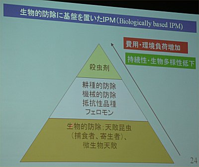 | 農薬を使わないということではなく、生物的防除に基盤を置いたIPM(総合的有害生物管理)。さらに生態系活用型IPMへと新しい取組みが始まっている。 |
