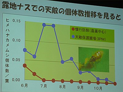 | 露地ナスの害虫ミナミキイロアザミウマの個体数を天敵を保護するような農薬使用の圃場と従来型の圃場を比較 |