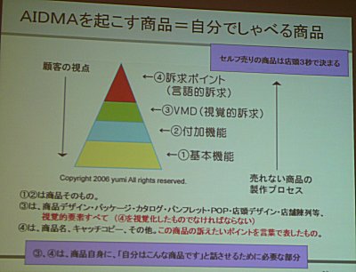 | スーパーやコンビニなどのセルフ売り商品は3秒が勝負。そのためには商品自身が「自分はこんな商品ですよ」としゃべる必要がある。商品デザイン・パッケージやキャッチコピーなどが大事 |