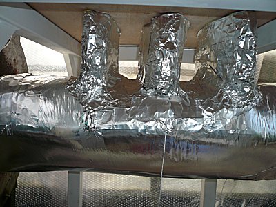 | 送風機から送られた温まった空気はビニールのダクトを通り、ハウス内の各所へ運ばれます。 |