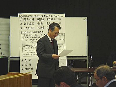 | 発表中は金賞を取ったコバテック都城のNC777(トリプルセブン)チーム、発表テーマは「柱・M2×P0.4タップ穴の改善」 |