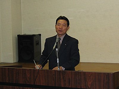 | 来賓あいさつの満行県議。いろいろな県の制度もあるので利用できるように考えています。 |