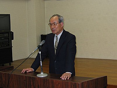 | 懇親会で亀井会長のあいさつ。産学官の事例として注目を集めています。協力体制を今年度もどんどん進めていきます。 |