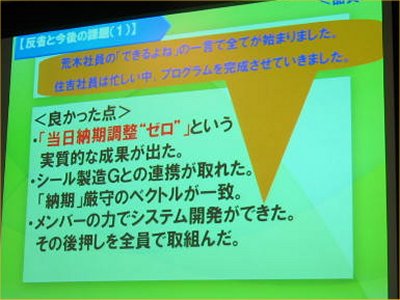 | サニー・シーリングさんの発表、当日の納期調整ゼロを目指し工程受注状況把握のシステムづくりに取り組みました。 |