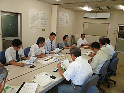 | 延岡市中小企業振興センターにおいて、「延岡市工業振興ビジョン」の説明を受ける。たっておられる方が飯干商工部長。 |