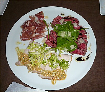 | 肉の前菜。手前は観音池ポークのローストしたもの、上は生ハムと都城牛のバルサミコソース |