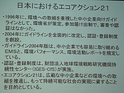 | 2004年からは環境省が策定したエコアクション21のガイドラインが改定され認証・登録制度が創設された。中小企業でも比較的取り組みやすい制度となっている。 |