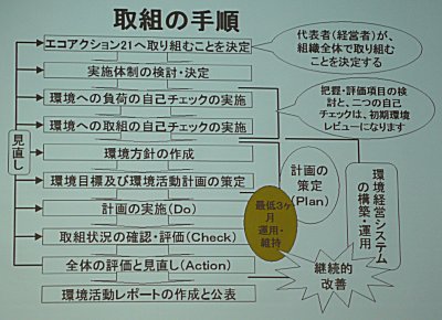 | ISO14001とほぼ同じ手順だが、環境活動レポートの作成と公表も追加されている。認証・登録費用はISOよりかなり安い。 |