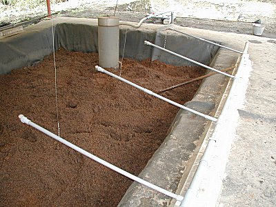 | 原水槽、スカムが表面に浮いています。ここでの固液分離が課題。 |