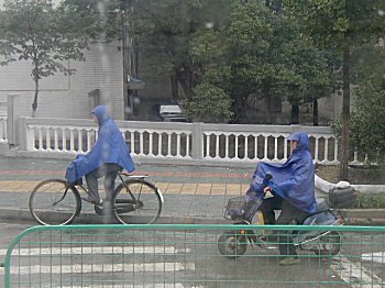 雨振りでも自転車・バイクが多い。みんなこのようなカッパを着ています。なかなか便利そうでした。日本では見ませんねえ。 |