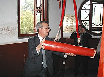 | この鐘をつくと10歳若返ると言う。若返った人:東郷さん、草野事務局長、新原さん、長峯さん、朝倉さん、朝倉夫人 |