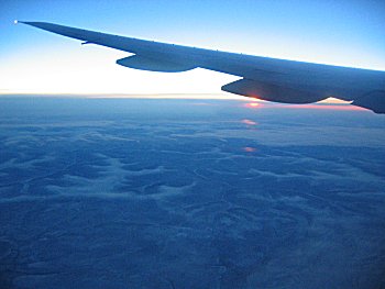 | シベリア上空を飛行中。凍土の上に夕日が沈む。 |