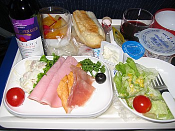 | 機内食は2回出ました。生ハム、鶏肉など |