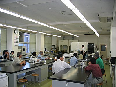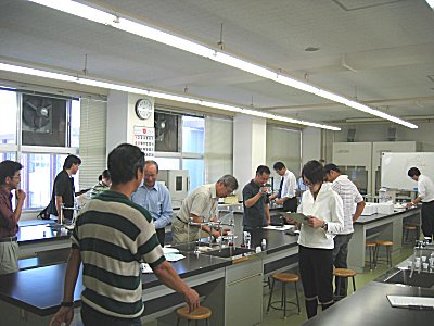 食味の評価には化学的評価法や物理的評価法の他に、人間の感覚器官(目・鼻・舌・手・足・皮膚)を用い五官(視覚・嗅覚・聴覚・味覚・触覚)にもとづいて、物の善し悪しや嗜好などを分析したり判定する官能検査というものがある。まず官能検査の特質や科学的方法について勉強し、具体的に焼酎の官能検査について詳しく解説があった。 その後化学実験室に移動し、味覚テスト(甘味・酸味・塩味・苦味・旨味)を実際に行った。2点比較法による濃度差弁別能力試験や濃度を低くした味覚テストなどを体験し、かなり個人差があることを実感した。 |