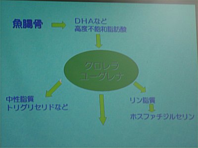 保健機能食品は栄養機能食品と特定保健用食品に分けられる。栄養機能食品は12種類のビタミンや5種類のミネラルが一定の基準を満たしていれば国の認可なしで表示できるが、効能は一般的な表示(例:カルシウムは骨や歯の形成に必要な栄養素です)に限られる。 特定保健用食品(トクホ)は臨床データを国に提出し認可を受ける必要があるが、具体的な効能(例:血圧を正常に保つことを助ける食品です)を書くことができる。さらに一般食品の枠に含まれる健康補助食品(一般的にはカプセル状などのサプリメントと呼ばれるものが多い)もある。 エコナクッキングオイルを例にとり脂質の消化吸収のしくみや、海の恵みとしてEPA、DHA、コラーゲン、フコイダン、スクアレン、アスタキサンチン、キトサン、タウリンなどの説明があった。「魚を食べると頭がよくなる」というのは本当なのか?、アルツハイマー型認知症とDHAの関係や魚や海草に含まれる有効成分の話を聞くことができ、日本型食生活が健康に良いということを再認識した。 林助教授は「みやざき産業クラスター創生促進事業」で「水産系廃棄物の有効利用」、「都市エリア産学官連携促進事業」で「高齢者QOLの向上に貢献する海洋性バイオマス活用技術の創出」に取り組んでおられるが、現在の研究の状況のお話もあった。DHAなどの不飽和脂肪酸をクロレラやユーグレナを使った微生物変換という処理を行い吸収されやすい形にする研究など興味深い講義であった。 |