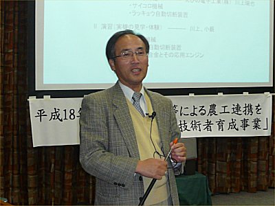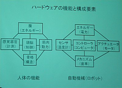 人間の欲求により道具>機械>自動機械と発達してきた。自動機械はハードウェアとソフトウェアからなる。ハードウェアは人体の機能と同じようにコントローラ(頭脳)があり、センサ(感覚器官)やメカニズム(骨格)、アクチュエータ(筋肉)からなる。アクチュエータには電気モータ、油圧装置、圧電素子、新しいところでは形状記憶合金などがありそれぞれについて説明があった。歯車や動力伝達装置、センサーについても学んだ。 後半は応用編としてまず、サイコロP&P(ピックアンドプレイス)装置を取り上げ、システム構成がどうなっているのか説明があった。サイコロの目がいくつかを認識する、サイコロの位置を認識しアームを移動してつまむなどの動作を実機を使って見ることができた。 また青果加工分野への自動機導入の事例としてラッキョウ切断機(茎と根を切断する)の説明があった。特に根を切断するためにどの方向に根があるのかを2台のCCDカメラで画像認識する手法について勉強した。 また形状記憶合金や圧電素子を実際に触ってその働きを確認できた。 |