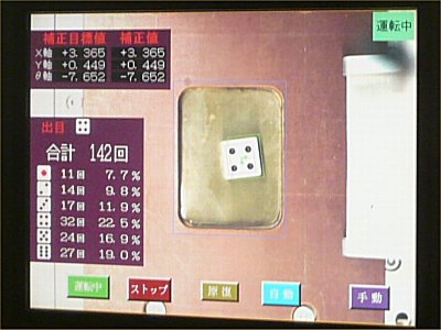 | サイコロを振り、出た目を画像処理し統計を取る。さらにサイコロの位置を認識して再度つまみあげサイコロを振るという動作をくり返す。 |