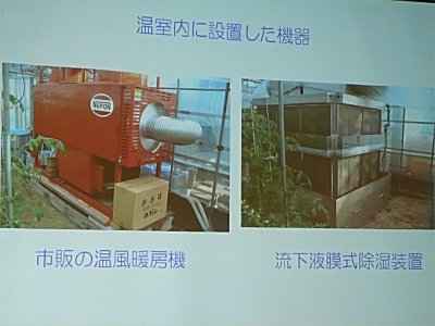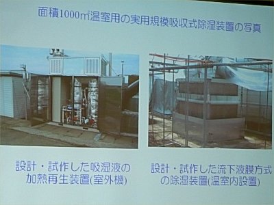 ビニールハウスなど農業温室は湿度が高くなることにより、病害の発生や品質低下、収穫量の減少などの弊害が発生する。また、冬場には温室内面へ結露が発生し外気への熱放散が増加することにより暖房費が増大する。 そこで農業用温室で使用できる低コストで大容量の除湿装置の開発を産学公協力により進めている。特に冬場の低温時にも除湿性能が低下しない吸収式除湿装置を開発し、実証実験を行っている。 温室面積も1,000uの実用規模で実証実験を行い、農薬散布回数、温風暖房機の燃料使用量、温室内の温度・湿度を計測、除湿装置を設置しない温室との比較を行った。 成果として病害発生や農薬散布回数が減少、温風暖房費が減少(省エネ効果)、収穫量の増加などが実証できた。 講義では湿度コントロールの基礎知識としていろいろな除湿法や吸収式除湿法の研究過程の紹介などもあった。 実証実験では収穫量のアップなど良い結果が出ており、低コスト化が実現できれば農家に普及するのではと感じた。(現在製品化に向けて研究中だそうです) |