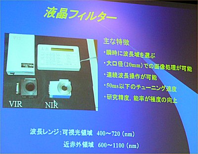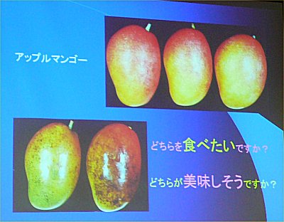 農産物の品質検査は現在は外部評価(外観による選別)やサンプルによる破壊検査が主である。しかし消費者の高品質や安全に対するニーズの高まりとともに全品検査が求められる時代がくるであろう。現に工業製品では全品検査があたりまえになっている。 全品検査になると非破壊検査技術が求められ、ミカンやキュウリなどの選果分野で導入が始まっている。 今後ますます精度の高い検査技術が求められるが、永田教授は分光画像による計測法(スペクトル画像計測法)に取り組んでおられる。 本講義では農産物の品質検査・評価の現状や非破壊検査のいろいろな方法について学び、さらにハイパースペクトルイメージングによる農産物の品質評価についての解説もあり今後の方向性を考える上で大変参考になった。 |