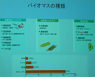 | バイオマスの種類としては「廃棄物系バイオマス」、「未利用バイオマス」、「資源作物」がある。スウェーデンは木材チップ発電など16%も有効利用しているが日本は0.9%とまだまだ低い。 |
