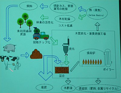 バイオマス(Biomass)の定義は「再生可能な、生物由来の有機性資源で、化石資源を除いたもの」である。 都城盆地では林業が盛んでスギ人工林も多い。しかし木材価格の低迷や高齢化などの問題があり、スギ製材品の高付加価値化および未利用の間伐材、林地残材、樹皮を有効利用する必要がある。 一方都城盆地は農畜産業が盛んであり、過剰な畜産廃棄物の窒素分を処理することも求められている。 現在都城盆地都市エリア産学官連携促進事業で、未利用の木材を低品質の木炭にし、豚糞と混合し燃焼することにより脱窒を行うと同時に発生する熱を利用して木材乾燥や野菜くず乾燥、さらには木酢液の有効成分を利用したり、焼却灰からリンなどの回収、微細藻類によるCO2固定など多方面の研究を行っている。 |