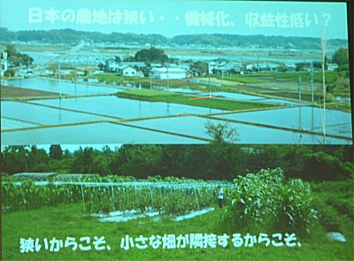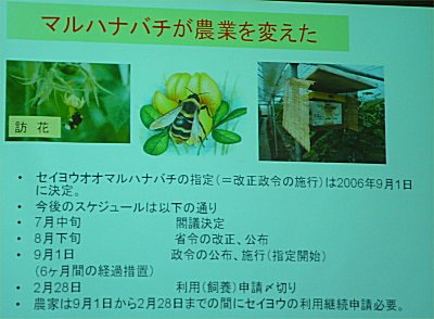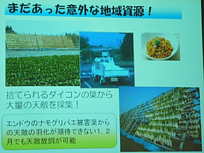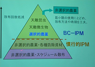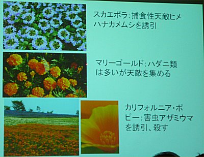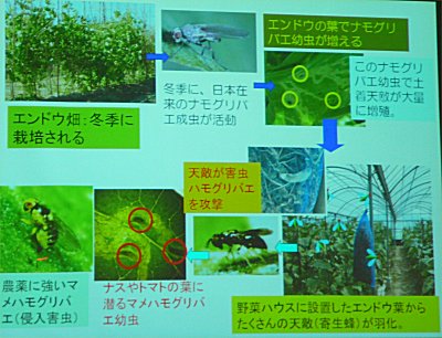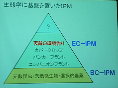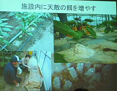 前回の大野助教授の講座No.10 「天敵を利用した減農薬栽培技術」では、日本の単位面積あたりの農薬使用量は世界一であることや、農薬を撒くことで天敵も殺し、結果として害虫が増え、さらに農薬が増えるという悪循環になっていること、IPM(総合的害虫管理)特に生態学に基盤をおいたIPMへと発想を変えていく必要性などについて学んだ。 今回は引き続き、環境負荷を抑えた農業についての講義であった。畑やビニールハウスには沢山の野菜が植えられており、自然の体系から考えるとおかしい。そのような環境では無農薬では無理で、最低限の農薬は必要であるが、今は量が多い。環境負荷低減型の農業にしていかなくてはならない。農薬の負荷が大きいと他の生物や作物に取り込まれるし、肥料を使いすぎると川に流れたり地下に浸透し、富栄養化や土壌・地下水の汚染につながる。 スイスなどでは有機・減農薬野菜の値段は高い。県の戦略として取り組む必要がある。高知県では小中学校の出前授業までして天敵を使った減農薬栽培の教育をしている。 農業の後継者不足の原因としては作業のきついことが大きな要因となっている。ナスやトマトの着果作業はホルモン剤で1つずつ処理していたが、マルナハバチを利用して手間が省けるようになってきた。 生態学に基盤を置いたIPMの目的は自然制御因子を最大限に引き出し、被害が及ばないレベルに管理することである。生物由来の(分解が早い)化学物質や合成フェロモンによる害虫防除などの技術も普及してきた。このように選択的農薬を使うことにより天敵や天敵微生物まで殺さないことが大事である。 モノカルチャー(単植栽培)はいろいろな害を引き起こす可能性がある。日本は農地がせまいので北海道を除きポリカルチャー(混植栽培)と言えるのではないか。ポリカルチャーの方が耕地生態系が複雑化し天敵を利用しやすい。 現在、天敵は値段が高く普及しないので、地バチなどの土着天敵の保護と積極的利用に取り組んでいる。エンドウの葉や大根の葉などについた寄生蜂の幼虫を利用できる。 花や飼料作物にも天敵を誘引できるものがある。農作物の周りに植えることで天敵のすみかにする、ハウス内に米ヌカなどで作った天敵の餌を置いて数を増やすなどの試みも行っている。 |