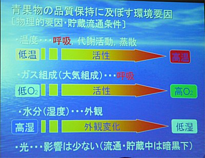 青果物の品質に影響する要因として温度・大気組成・水分などがある