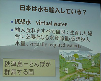 | グローバル化によりいろいろな国から食料を輸入するが仮想水という考え方がある。 |