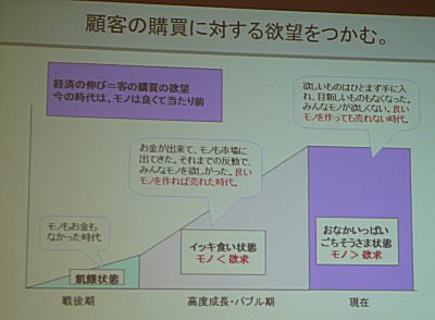| 顧客の購買意欲は経済の動きと同じ。現在はごちそうさま状態なので、良いものを作っても売れない時代 |