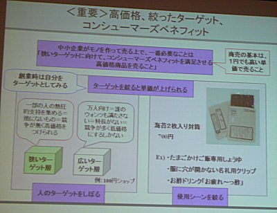 | 狭いターゲットに向けて高価格商品を売っていく。ターゲットは人もしくは使用シーンでも良い(例:たまごかけご飯用の醤油) |