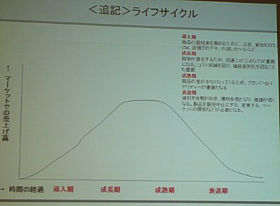| プロダクツ・ライフサイクル、頂点(最高に売れている時点)までかかった時間と同じ時間で衰退する傾向がある。 |