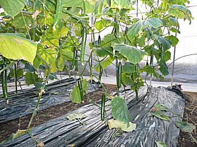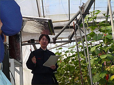 | キュウリ栽培を行っているビニールハウスに実験装置を付けさせていただきました。 |