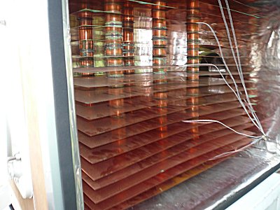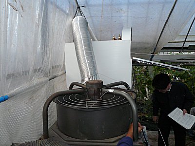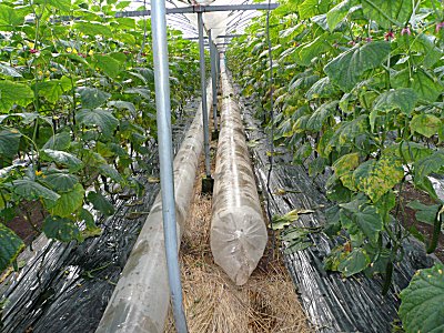 | 送風機から送られた温まった空気はビニールのダクトを通り、ハウス内の各所へ運ばれます。 |