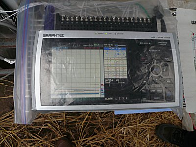 | 測った温度はデータロガーで収集記録します。今回は13か所に温度センサーを設置しました。 |