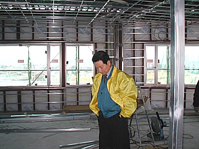 | 「えーと、床は10cmくらいのふかふかの絨毯を敷こうかなー」 2階は都城を一望できる社長室。。屋上からは霧島がばっちり見える。夏はビアガーデンができ霧島工業クラブ会員の招待もありそうなので楽しみ。 |