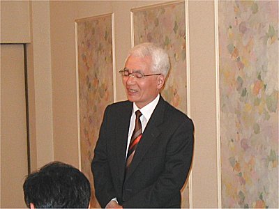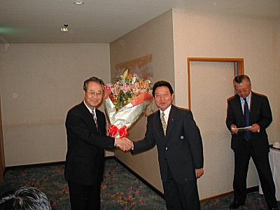 | 懇親会ではまず、新会長の亀井校長に歓迎の花束が贈られました。代表幹事と握手。司会は東郷さん。 |