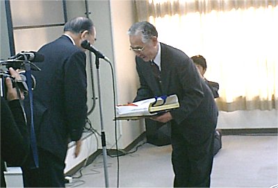 | 岩橋辰也都城市長より委嘱状を受ける松浦前会長 (撮影:窪田次生) 〈委嘱理由〉 |