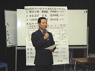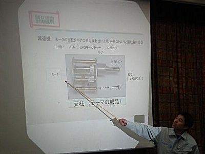 | 発表中は金賞を取ったコバテック都城のNC777(トリプルセブン)チーム、発表テーマは「柱・M2×P0.4タップ穴の改善」 |