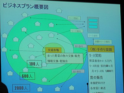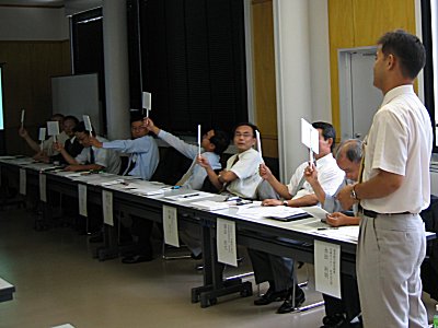 | 審査員が発表の事業計画に対しいくら出資するか、金額を札で示す。 |