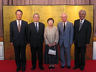 | 4名の校長先生が揃いました。 右から 第9代亀井伸雄校長(霧島工業クラブ第5代会長) 第7代江藤守總校長(霧島工業クラブ第3代会長) 江藤先生の奥様 第5代篠塚脩校長 (霧島工業クラブ初代会長) 第8代松浦修平校長(霧島工業クラブ第4代会長) |