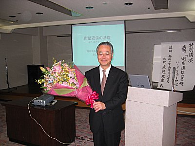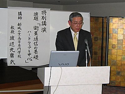 | 渡辺光庸教授の特別講演、衛星が地球を回るしくみや通信衛星の構造など詳しく講演していただきました。NTT勤務時代に開発に携わった衛星が今でも稼動中だそうです。 |