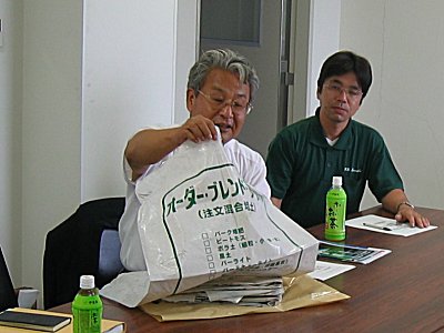 | 「このポリエチレン袋を大量に廃棄しなければならず困っている」と説明中の牧元さん |
