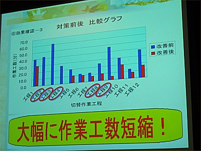 | 切替工数367分を30%削減の目標257分として活動を行ったところ、何と68%短縮の118分に成功しました。 |