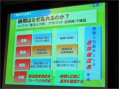 | 当日納期調整ゼロの目標を達成でき、営業と製造の連携が取れた。さらに今後「見える工程」の実現へ向けて取り組むこととした。 |