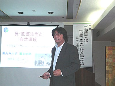 | 6月通常総会と特別講演会、懇親会を行いました。特別講演は南九州大学園芸学部の山口健一教授にお願いしました。 演題は「農・園芸生産と自然環境 −合成農薬,化学肥料に代わる生物活用術ー」 【講演要旨】 21世紀は環境の時代と言われ,農業においても’自然環境’に配慮した生産技術の確立が求められています。今回の講演では,合成農薬や化学肥料に依存した日本の農・園芸の現状を解説し,バイオ農薬など生物機能を利用した環境調和型の病害虫・雑草の防除方法に関する最新情報を提供します。また,演者の研究テーマの一つである南九州で顕在化している外来侵入雑草の問題を取り上げ,微生物を活用した雑草の制御法について展望します。 【演者の略歴】 千葉大学園芸学部卒業,同大学院(環境緑地学)修了. 1993年からNY州コーネル大学植物科学へ客員研究員として3年間留学し,米国農務省の研究プロジェクトに参画.帰国後は,三井化学ライフサイエンス研究所で,経済産業省などの植物バイオ研究をチームリーダーとして遂行. 2003年から南九州大学園芸学部.宮崎市在住,千葉県出身48歳. 専門は環境植物保護学. |